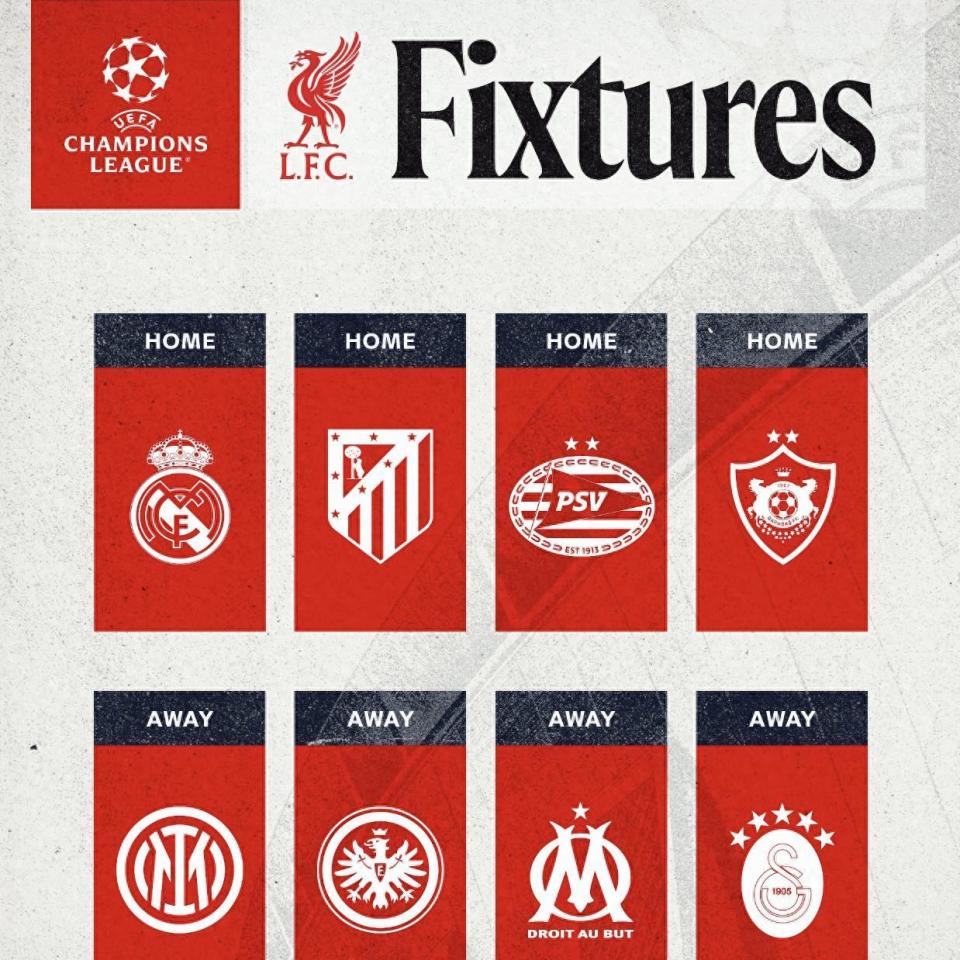 利物浦本赛季欧冠小组赛将面临严峻考验,主场将迎战皇马、马竞、埃因霍温和卡拉巴赫,客场则要挑战国米、法兰克福、马赛和加拉塔萨雷。加之英超联赛竞争激烈,球队将面临密集赛程的挑战,这对阵容深度提出了更高要求。
